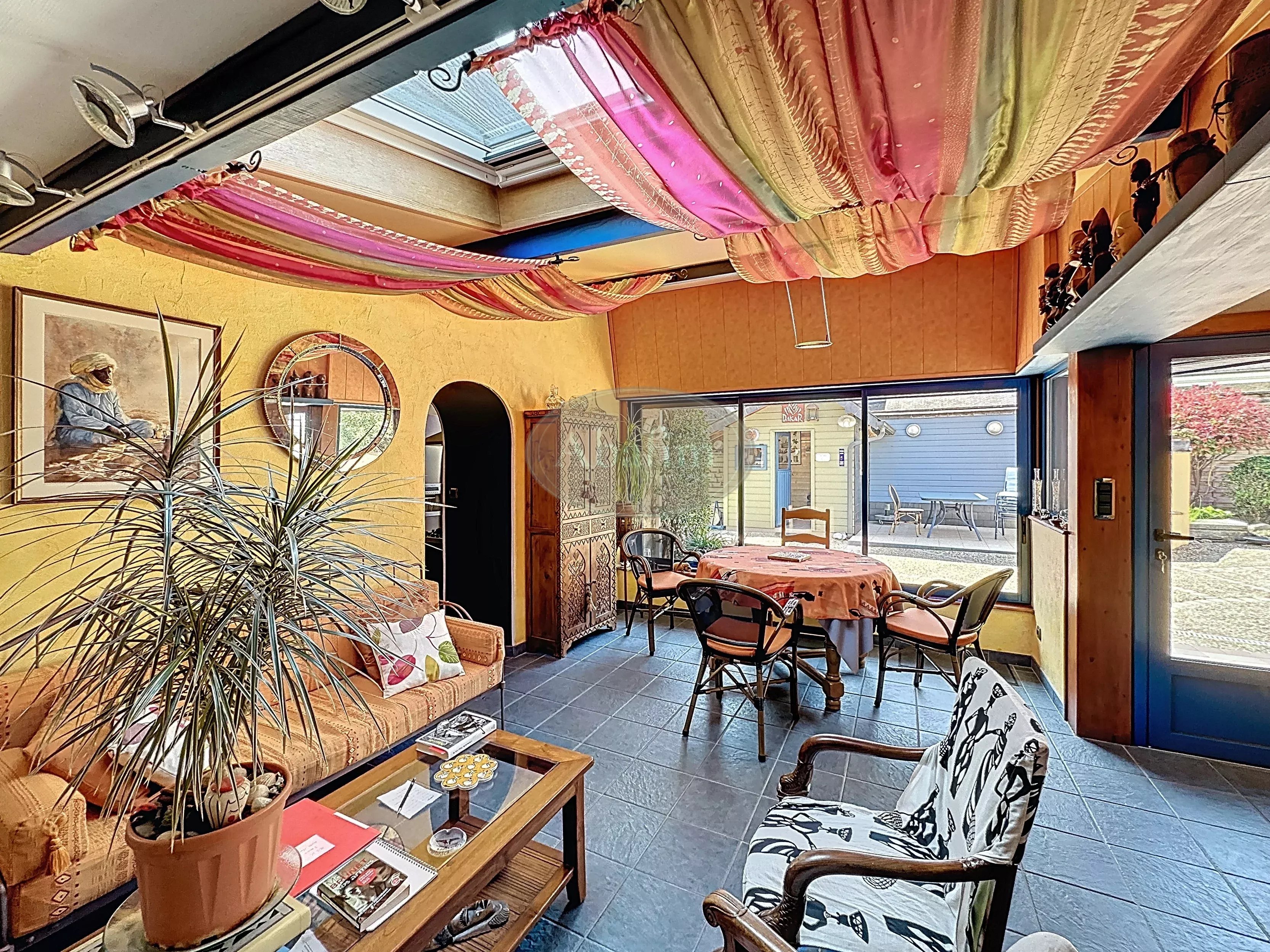 Au rez-de-chaussée : un salon séjour avec cuisine attenante moderne, un salon d’été agréable, une chambre avec salle de douche, une cave à vin et un garage.